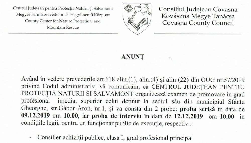 Organizează concurs de angajare, la sediul său din municipiul Sfântu Gheorghe, str. Gábor Áron, nr. 1, și va consta din 2 probe: proba scrisă în data de 24. 10. 2019 ora 10.00, iar proba de interviu în data de 28. 10. 2019 pentru ocuparea, pe perioadă nedeterminată, a unei funcții contractuale de execuție vacante în cadrul Compartimentului “Serviciul Public Salvamont”