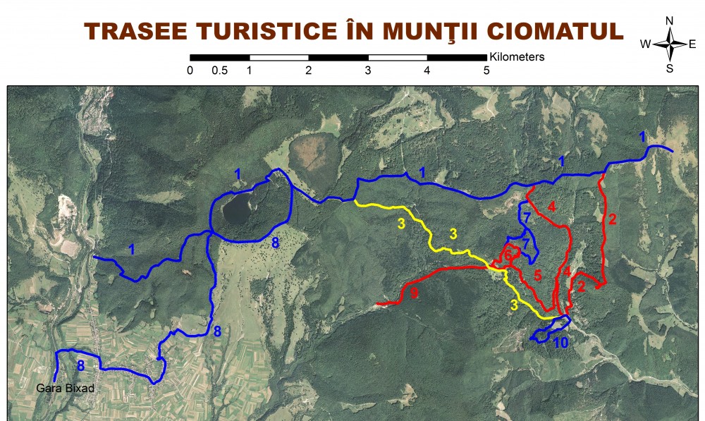 Harta traseelor turistice în Munţii Ciomatul
