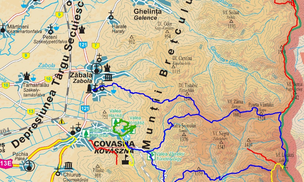 Traseul tematic „Hankó – Horgász” porneşte de la Hotelul Clermont din oraşul Covasna şi se termină tot acolo. Traseul are o lungime de 6 km. Traseul tematic merge pe un drum forestier pietruit, punctul de pornire este situat la 643 m altitudine, după parcurgerea distanţei de 2,6 km se ajunge la un vârf de deal (767 m alt.). De aici începe coborârea spre valea pârâului Hankó, de unde pe un drum local, tot pietruit se ajunge la punctul de pornire.