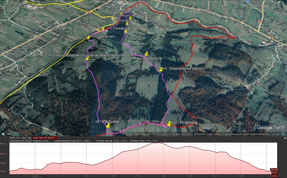 Staţiile traseului: 1 - Panoul de pornire, 2 – Râul Buzău, 3 – Întorsura râului Buzău, 4 – Formarea văii, 5 – Fâneaţă tradiţională, 6 – Păşunat tradiţional, 7 – Gospodărirea pădurii, 8 - Piramida, 9 - Pădurea, 10 – Livezi tradiţionale din zona de deal şi munte, 11 – Izvoare de apă.